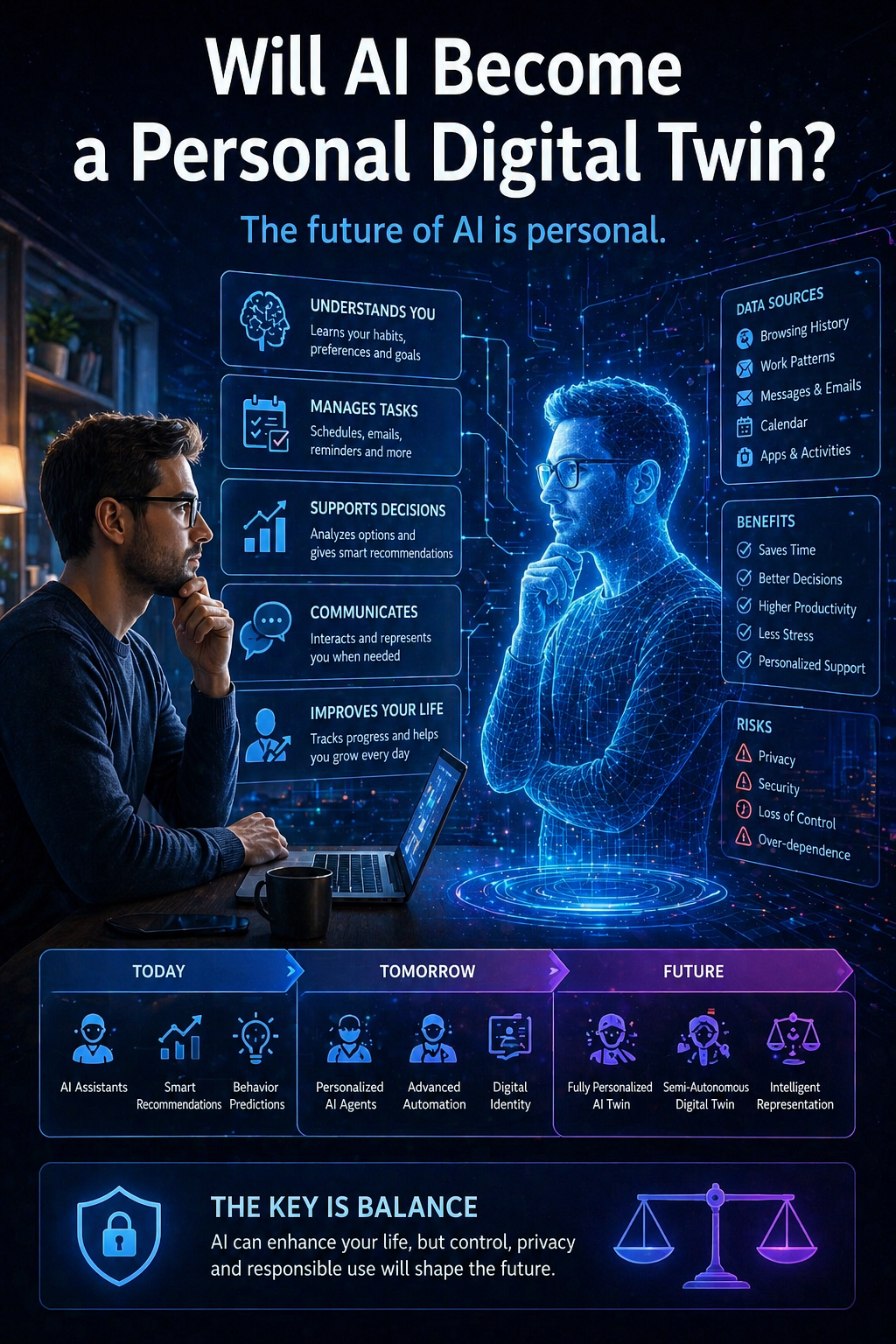 Introduction Imagine having a digital version of yourself — one that understands your habits, remembers your preferences, and can assist you in daily decisions. This concept is known as a digital twin, and with the rapid development of Artificial Intelligence, it is becoming more realistic than ever. But will AI truly evolve into a personal digital version of ourselves? In this article, we explore what digital twins are, how AI is making them possible, and what this could mean for our future.